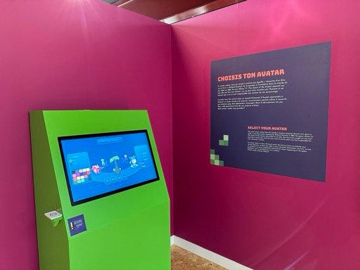 The Grand Nancy team wanted an exhibition that involved visitors, giving them the opportunity not only to play but also to bring their avatar throughout the exhibition. Jimmy then proposed equipping each terminal with NFC readers and giving each visitor a badge. Thus, the exhibition begins by creating an avatar, which is saved to their badge, and they can then retrieve it in each game, whether solo or multiplayer, until the end of the exhibition. Upon leaving, they badge one last time to appear on the scoreboard!